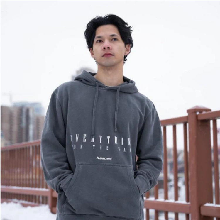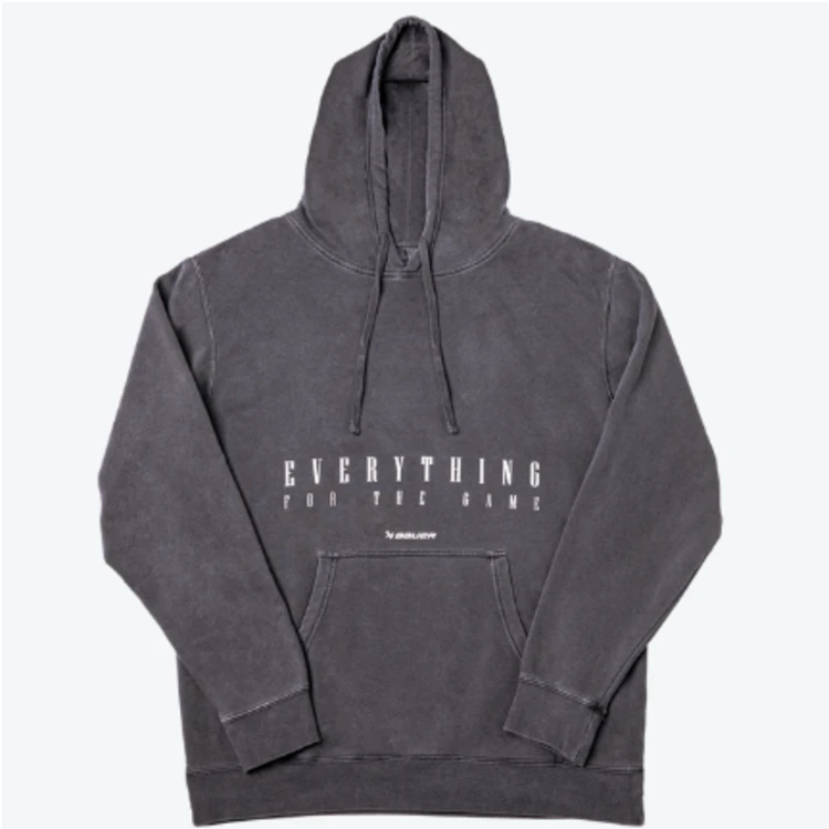 Bauer’s Everything for the Game Hoodie is a unisex midweight pigment dyed hooded pullover with individual and unique vintage character. The Everything for the Game Hoodie is as comfortable as it is eye catching, made from ultra soft cotton/polyester blend fleece in vintage black colorway. Features jersey lined hood, sewn eyelets, and 1×1 ribbing at cuffs and waistband in a standard unisex fit. Screen printed graphics.