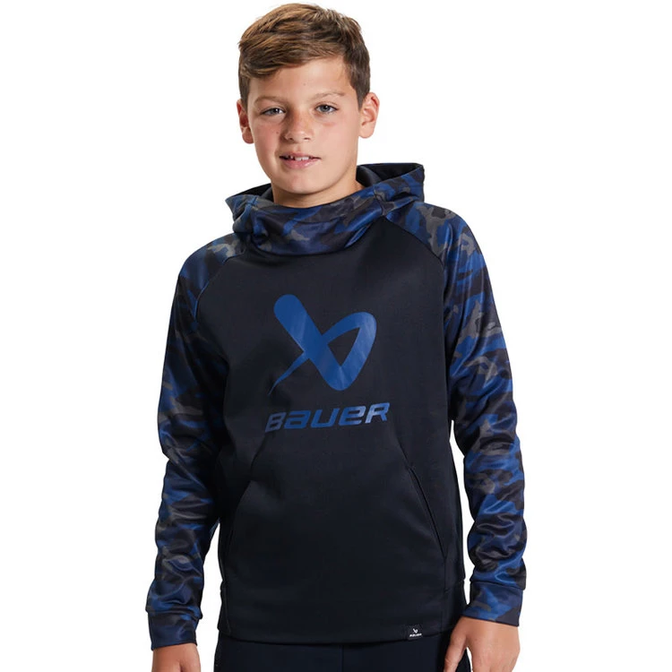 Bauer’s Raglan Camo Hoodie will have you looking sharp at the rink or around town with an allover printed fleece hoodie. The Raglan Camo Hoodie has a kangaroo pocket to keep your hands warm and lined hood for when the wind blows across the pond.