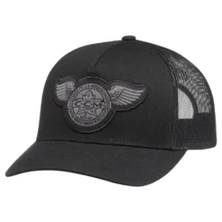 - Body: Structured adjustable mesh back trucker with mid-crown. Polyester front panels & structured black mesh back panel with snap closure.
