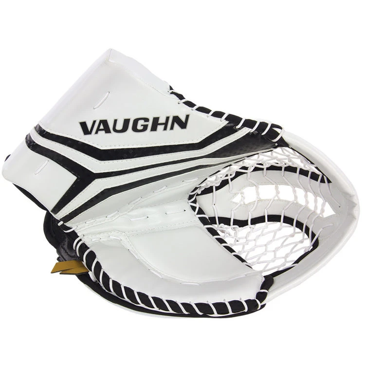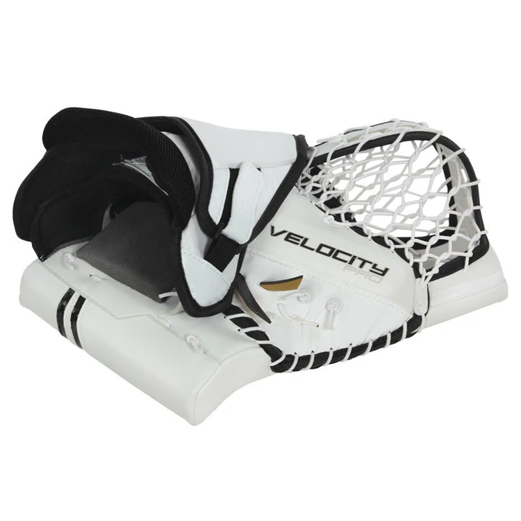 Vaughn’s Velocity V10 Pro Goalie Catch Glove is an all new design and shape to maximize net coverage. The Velocity V10 Pro has a new wide span and deep T-web design along with a one-piece cuff and thumb. With an easy close design with deep pocket area, molded palm and front thumb insert along with defined break points for easy closing the Velocity V10 Pro will help you make the big save.